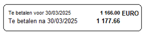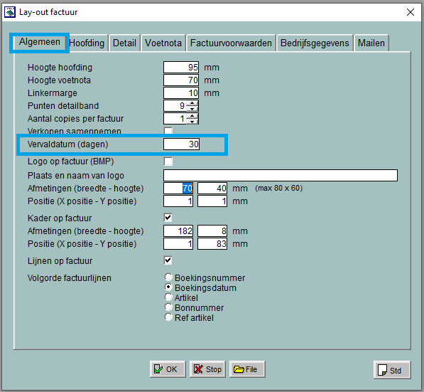 Als je geen betaaltermijn bij de klant invult, dan neemt hij de Vervaldatum (dagen) van bij de algemene instellingen van de Lay-out factuur. ("Algemeenheden - Lay-out factuur - tabblad Algemeen")