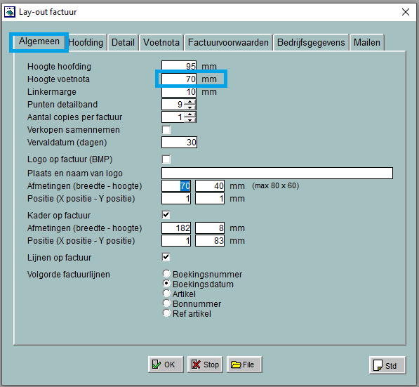 De “Hoogte voetnota” moet natuurlijk voldoende groot zijn omdat er een extra kader op de factuur verschijnt hierdoor: