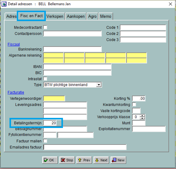 Bij de klantenfiche kan je op het tabblad “Fisc en Fact” best ook de betalingstermijn van de klant invullen.