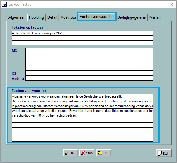 ("Algemeenheden - Lay-out factuur - tabblad Factuurvoorwaarden")