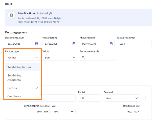 Als je zelf aankoopborderellen opmaakt om te versturen, moet je steeds goed nakijken dat het 'Factuurtype' op 'Self-billing' staat: